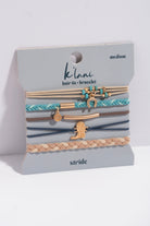 STRIDE  Our Stride set includes five bracelets that double as hair ties in the cutest coastal cowgirl colors of blue, brown, cream and teal. This set features dainty boot and horseshoe gold charms that will remind you to lengthen your stride and cowgirl up.